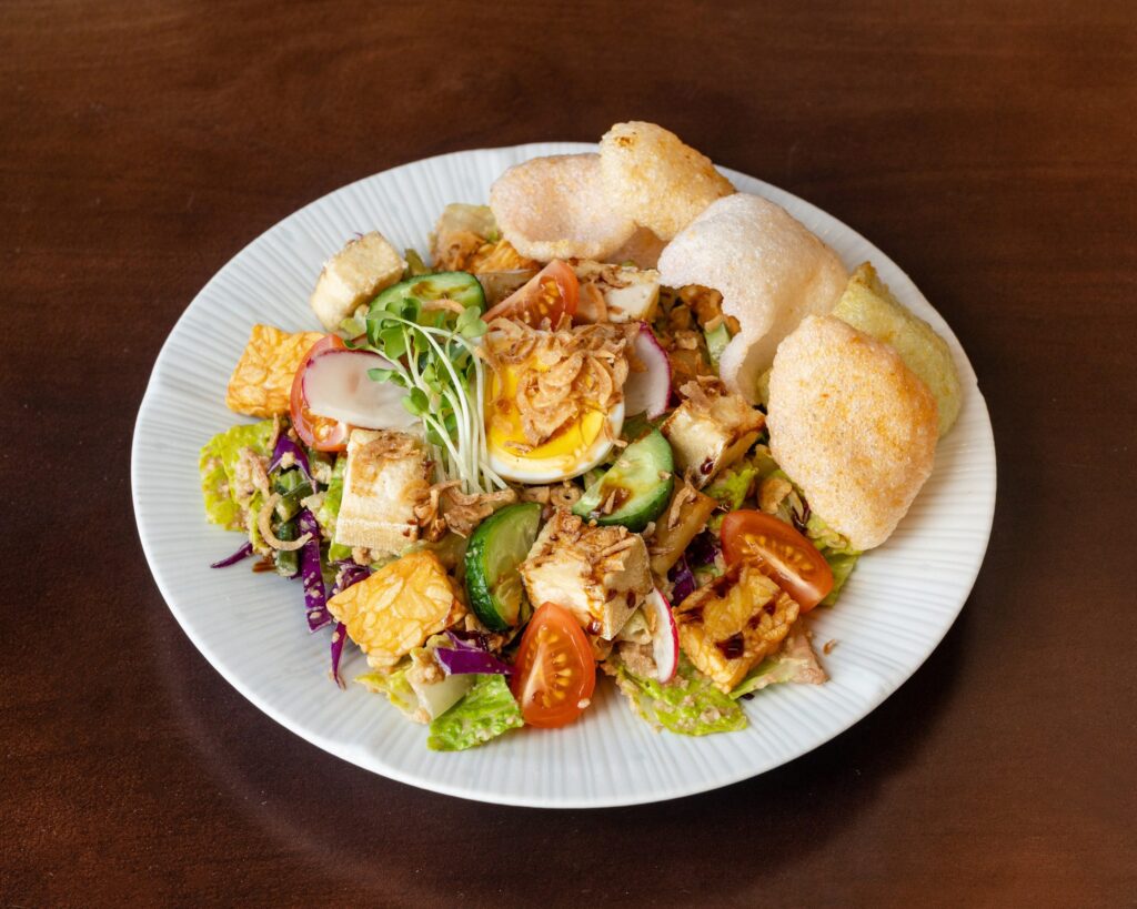 traditional Indonesian salad. mix of fresh vegetables, steamed vegetables, tempeh, tofu, egg and peanut sauce.